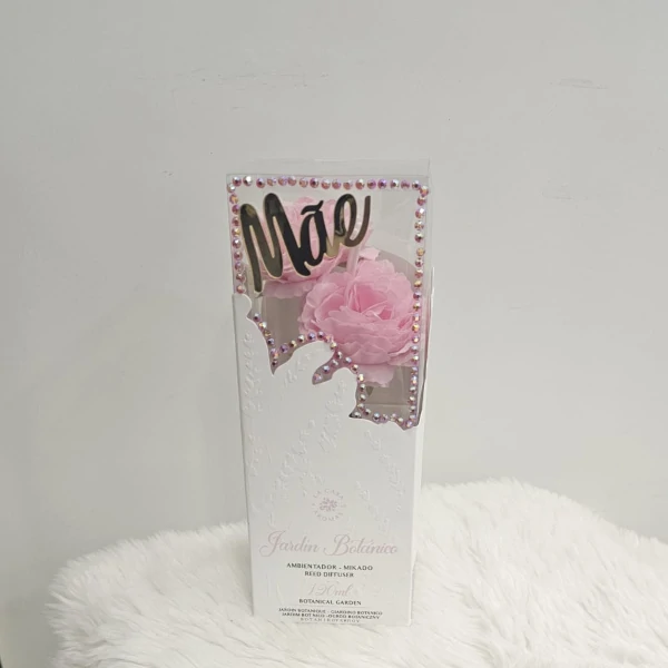 Ambientador Mikado “Jardim Botânico Mãe” com flores artificiais e cristais em caixa premium.
