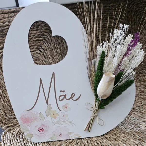Placa Coração em MDF com rosa e flores preservadas. Uma lembrança perfeita para o Dia da Mãe.