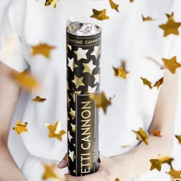 Canhão de 80 cm, de ar comprimido com confetes de papel no seu interior.