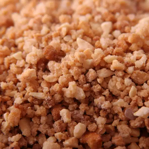 Amendoim crocante picado submetido a um processo de torrefação, ocorrendo depois uma mistura com açúcar e posterior caramelização.